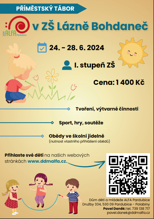 DDM Alfa vám nabízí v termínu 24. - 28. 6. 2024 Cena: 1 400 Kč (I. stupeň ZŠ) viz www.ddmalfa.cz.